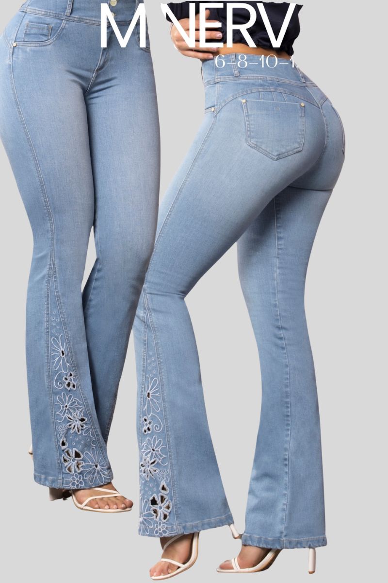 Jean bota ancha con bordado floral, Destaca con estos hermosos jeans de corte bootcut, confeccionados en un suave y cómodo denim azul claro. Este modelo presenta un delicado bordado floral en los dobladillos, lo que añade un toque femenino y sofisticado al diseño clásico.