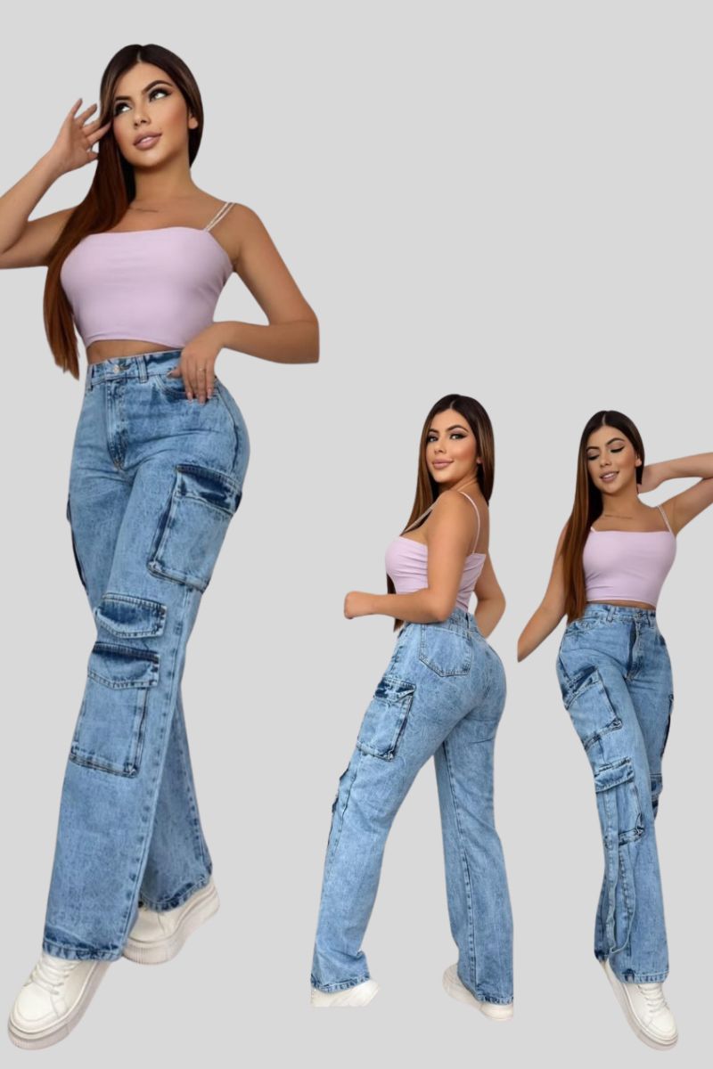 Jean urbano con bolsillos. Añade un toque moderno a tu look con estos jeans de corte cargo, diseñados para ofrecer comodidad y estilo. Confeccionados en un denim de tono azul claro, estos pantalones cuentan con detalles de bolsillos grandes en las piernas, lo que les da un toque único y funcional. El corte recto y relajado asegura un ajuste cómodo, mientras que los bolsillos añaden un toque de estilo urbano y práctico.
